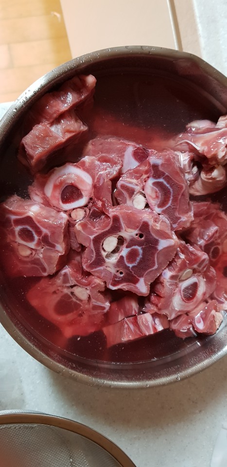 찬물에 여러 번 핏물이 안 나올 때까지 헹궈줍니다