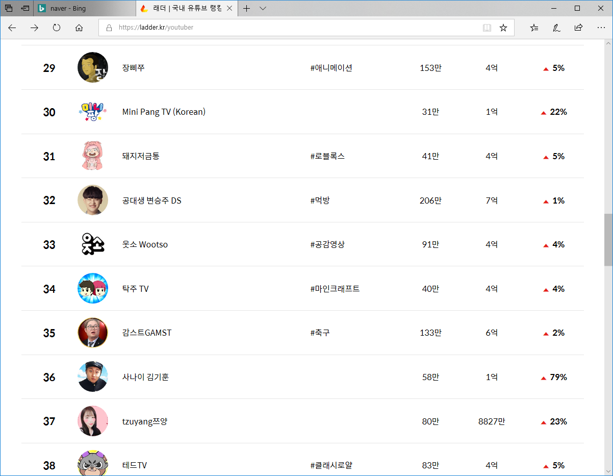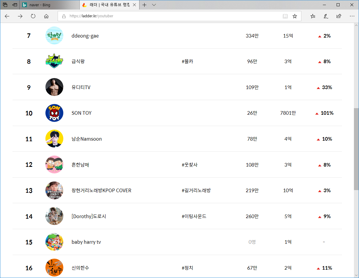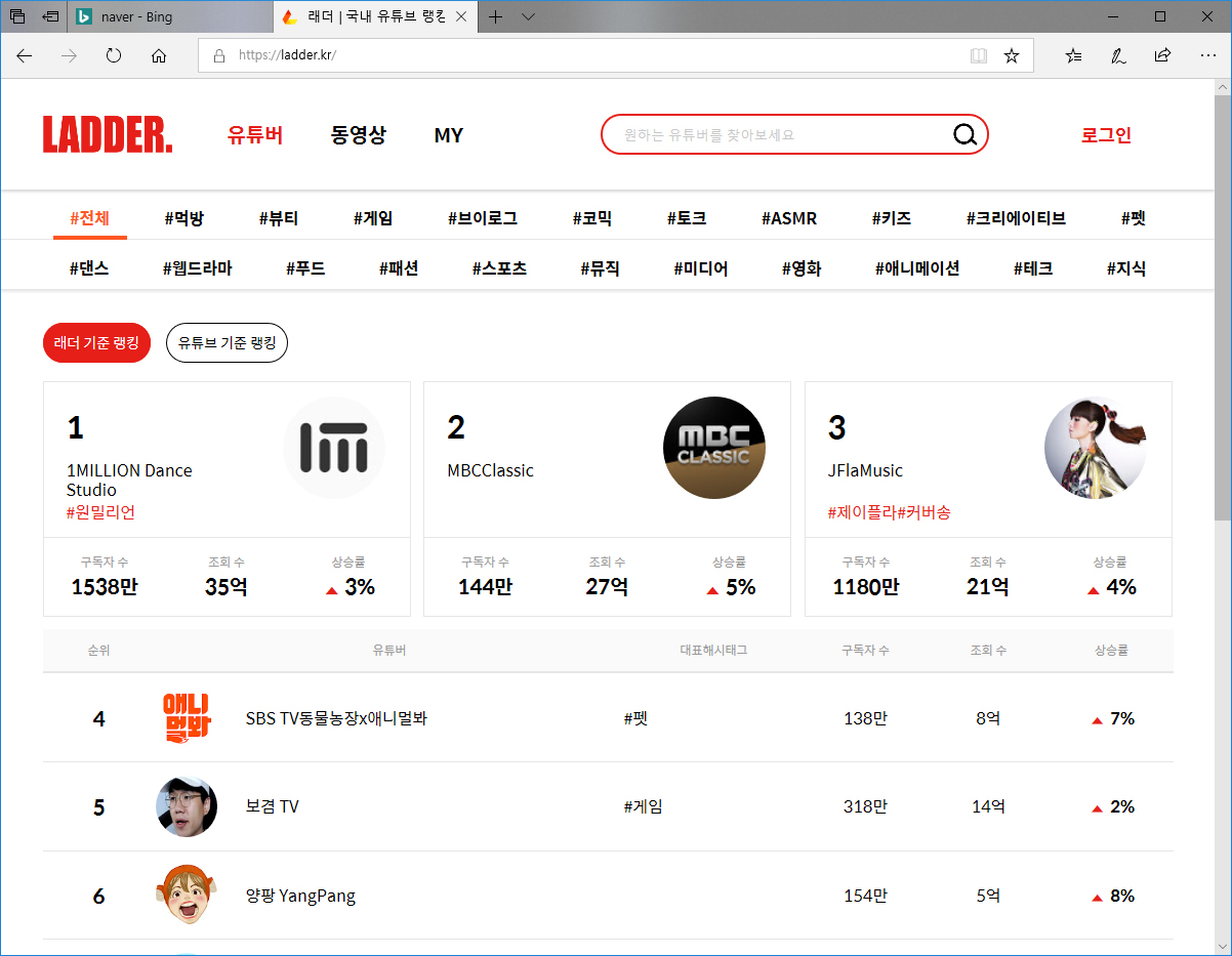래더 | 국내 유튜브 랭킹과 구독자 순위