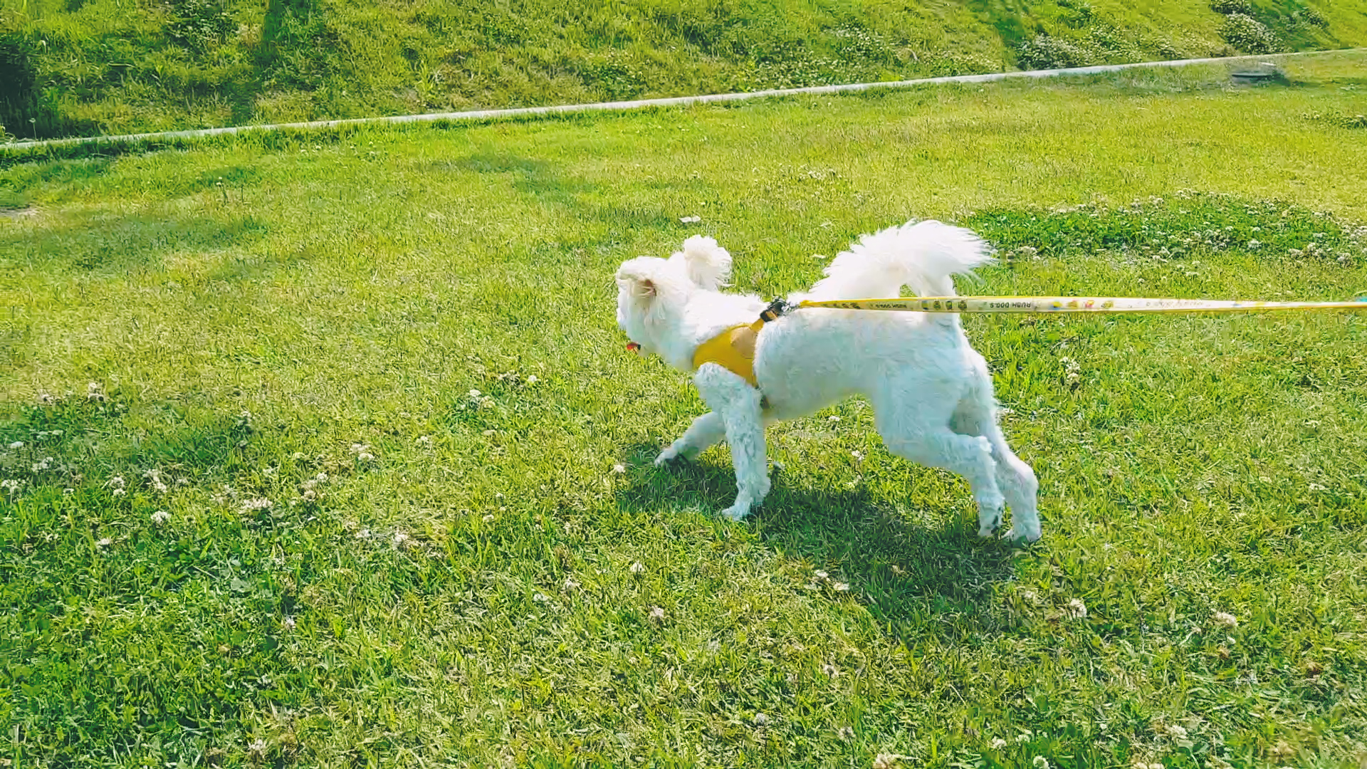 김 콩이 오늘 목욕할 거니 잔디밭 마음껏 즐기도록 놔뒀어요